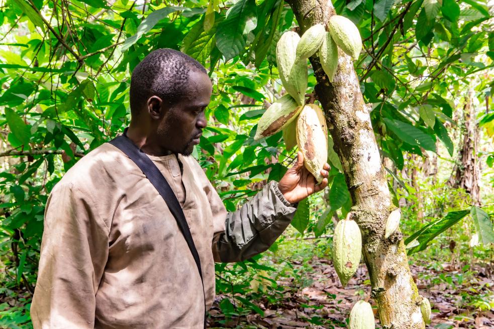 4月8日,在喀麦隆西南大区首府布埃亚郊区,农户在种植园里观察可可果长势。 新华社发(穆朗·廷古姆摄)