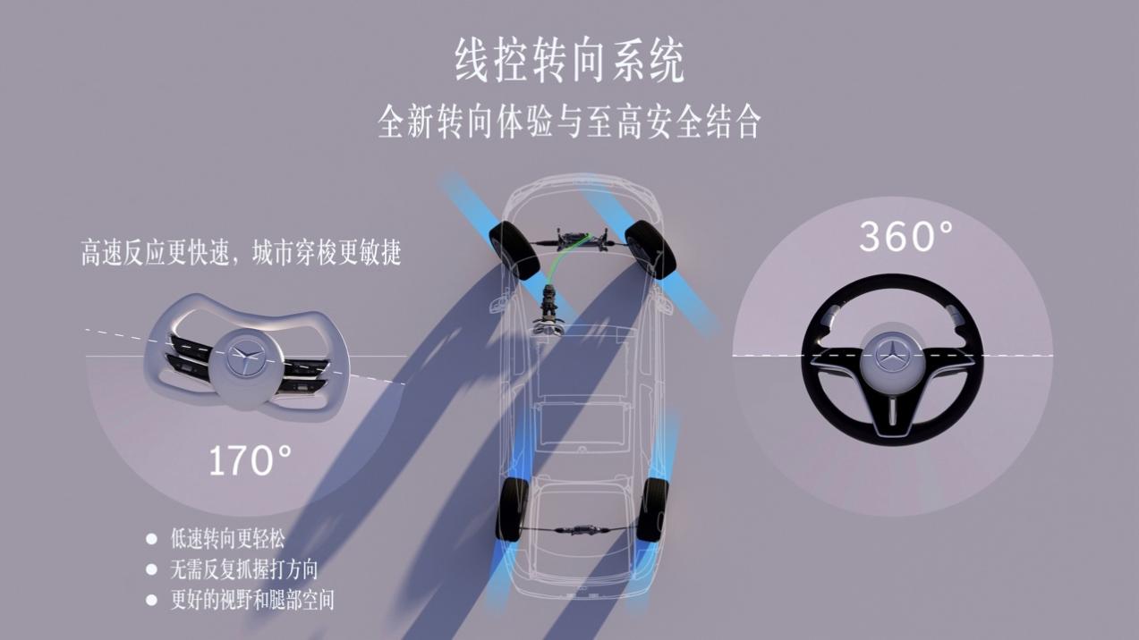 凭借线控转向技术,梅赛德斯-奔驰实现了全新转向体验与至高安全的结合。对于Vision Iconic概念车这类较长的车型,该技术的优势愈发凸显,特别是在搭配后轮主动转向系统后,既可以大幅提升操控性,也能让机动性与泊车便利性显著提高。这是因为线控转向可进一步降低转向力度,并且在泊车时不需要反复抓握方向盘。该技术无需在方向盘与前轮之间建立机械连接,驾驶员的转向请求可通过控制单元与执行器快速、直接地传递给车轮。