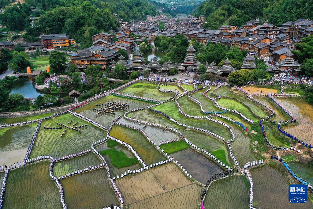 6月10日,在贵州省黔东南苗族侗族自治州黎平县肇兴侗寨,以侗寨作背景,以田园为舞台,来自黔东南州各县市的歌手与现场游客、群众约万人合唱侗族大歌等歌曲,展示人类非物质文化遗产之美。