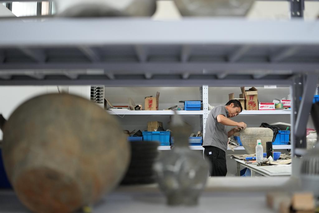工作人员在陕西省考古研究院秦汉考古基地修复秦咸阳城遗址出土文物。 唐浦萌 摄