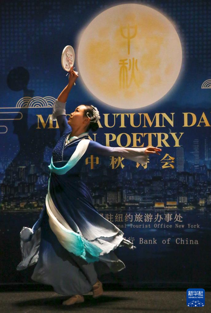 10月13日,舞者在位于纽约的联合国总部举行的2025“天涯共此时——中秋诗会”上表演舞蹈。