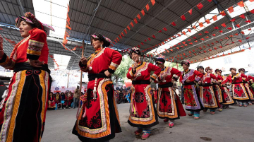 11月19日,在四川省汶川县城,身着民族服饰的妇女在非遗大巡游活动上表演。