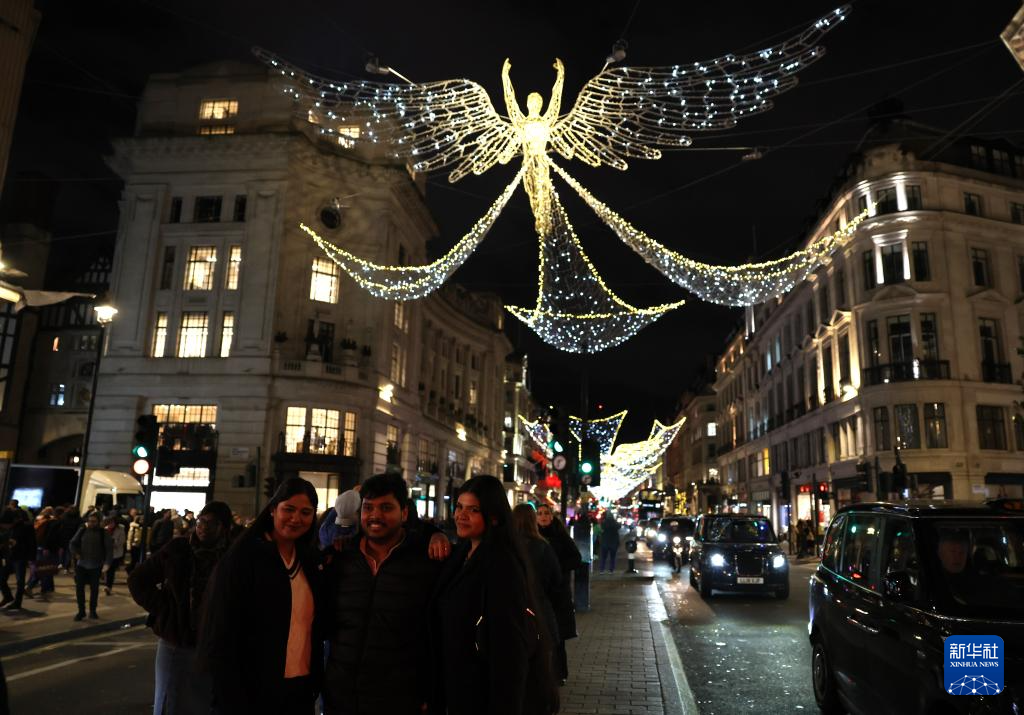 12月17日,在英国伦敦,人们在彩灯下拍照留念。新华社记者 李颖 摄