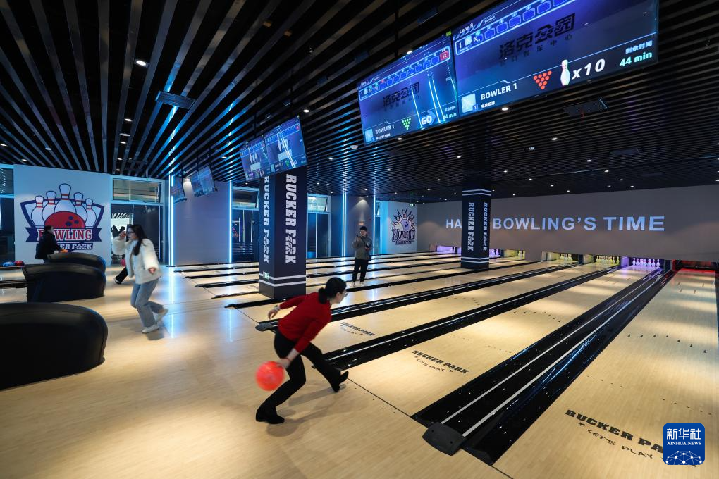 1月8日,市民在金华市金东区金漪湖云蝶中心洛克公园里打保龄球。洛克公园是集运动健身、休闲娱乐、体育培训、赛事活动、智能体验于一体的体育公园。