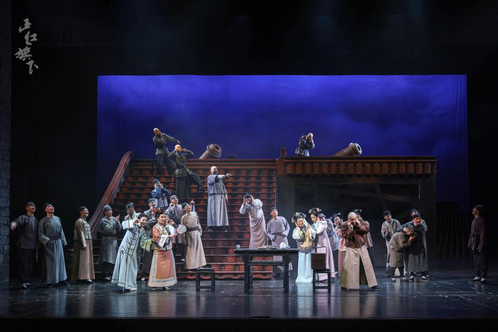 这一创作理念在舞台视觉上得到了凝练表达:以“红色屋顶”作为核心意象与支点,不仅还原了古都风貌,也构建出一个可供观众“登高望远”的历史视点。