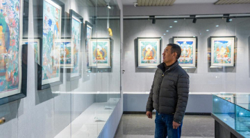 2月10日,罗布斯达在西藏唐卡画院的展厅里观赏自己的唐卡作品。