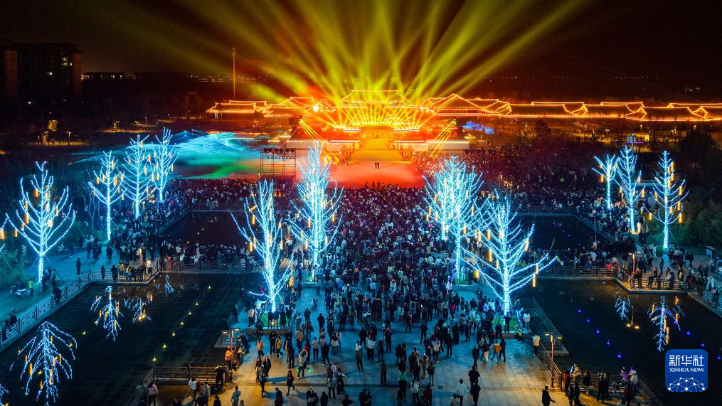 2月21日,游客在荆州楚文化数字产业园观看“荆州十二时辰·楚乐八百年”演出(无人机照片)。