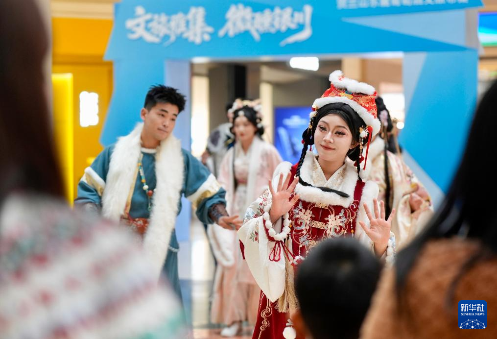 3月21日,在银川市金凤区一商场内,来自漫葡·看见贺兰沉浸式演艺小镇的演员与市民互动。