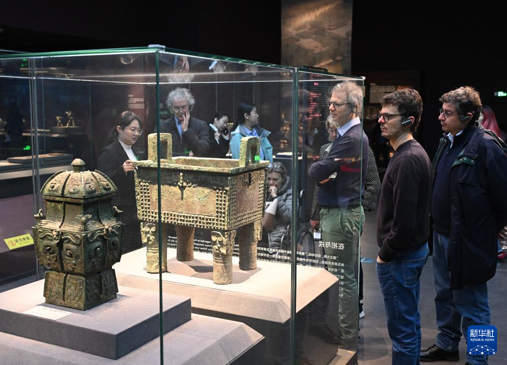 4月2日,参加中意文化遗产保护修复国际圆桌会议的意方专家在位于北京的中国考古博物馆参观馆藏文物。