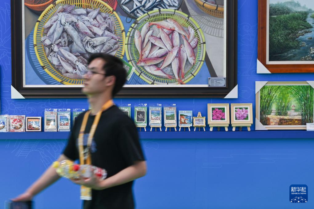 4月15日,在第六届消博会上,一名男子走过源自海南当地农民画师屯昌油画创意的冰箱贴和摆件。