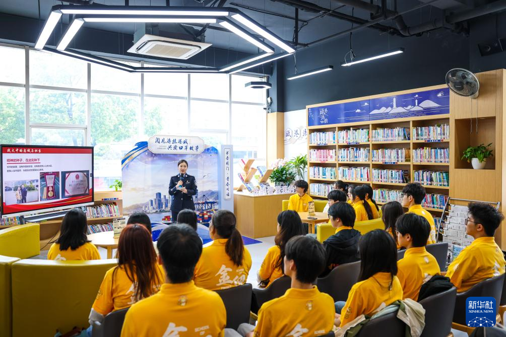 4月21日,在温州市瓯海区警营城市书房,温州海警局执法员赵海然在“真人图书馆”活动中与青年学生分享自己执行任务时的故事。