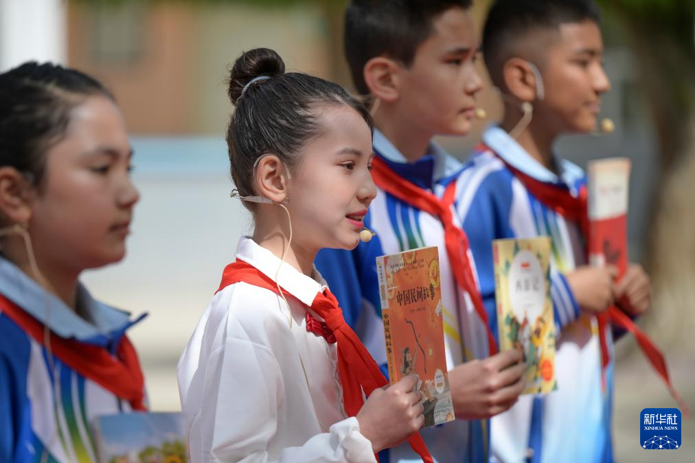 4月21日,在新疆新和县依其艾日克镇托特塔什村,小朋友在表演经典诵读。