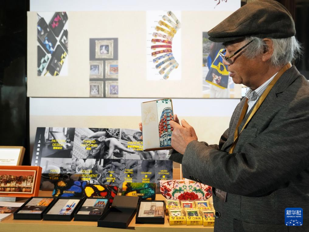 4月25日在外场展区拍摄的运用上海绒绣非遗技艺的文创产品。