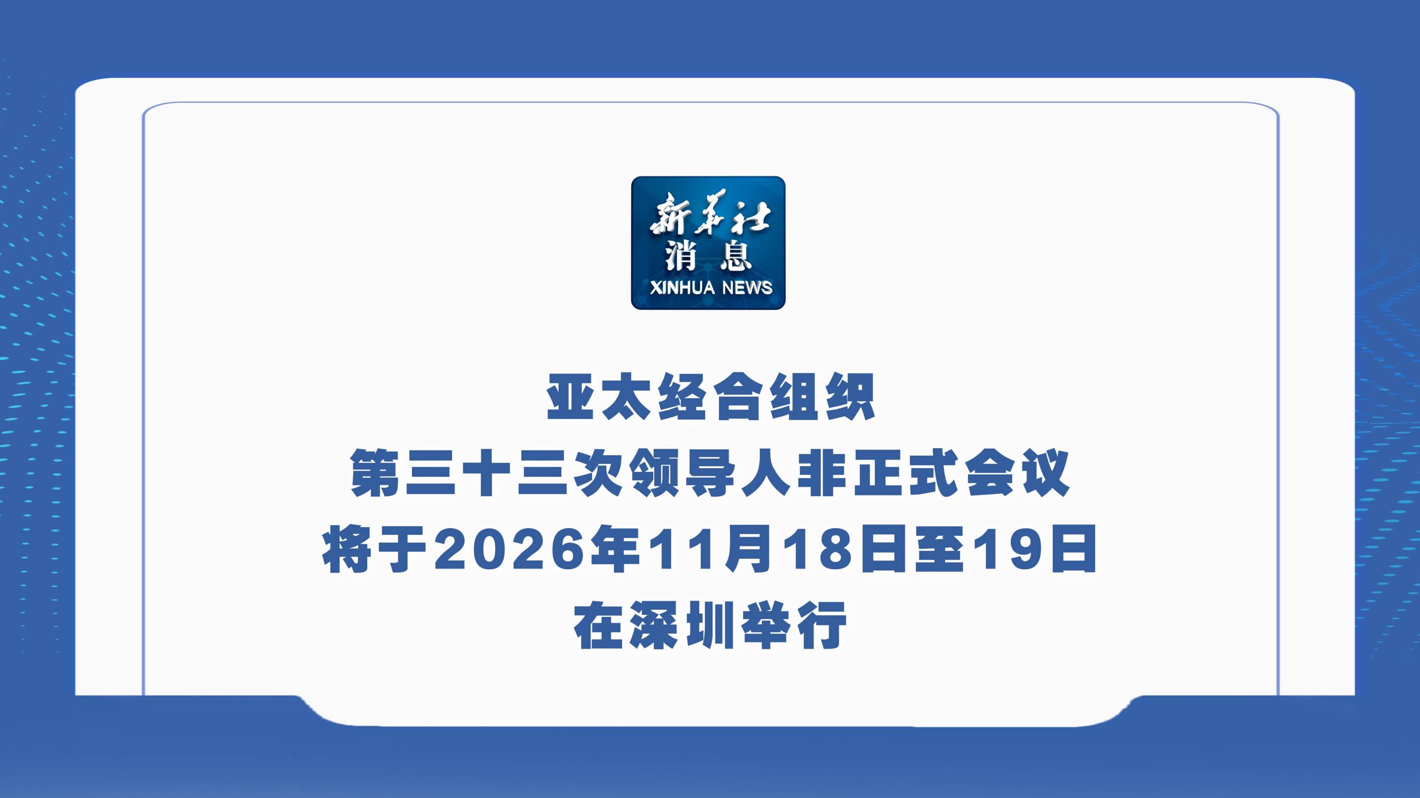 新华社消息丨亚太经合组织第三十三次领导人非正式会议将于2026年11月18日至19日在深圳举行