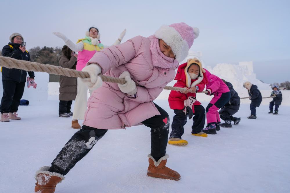 1月8日,小朋友在太阳岛雪博会园区玩雪地拔河。