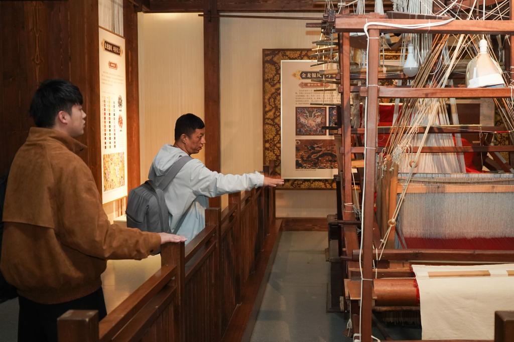 1月16日,游客在江宁织造博物馆参观云锦织造机。