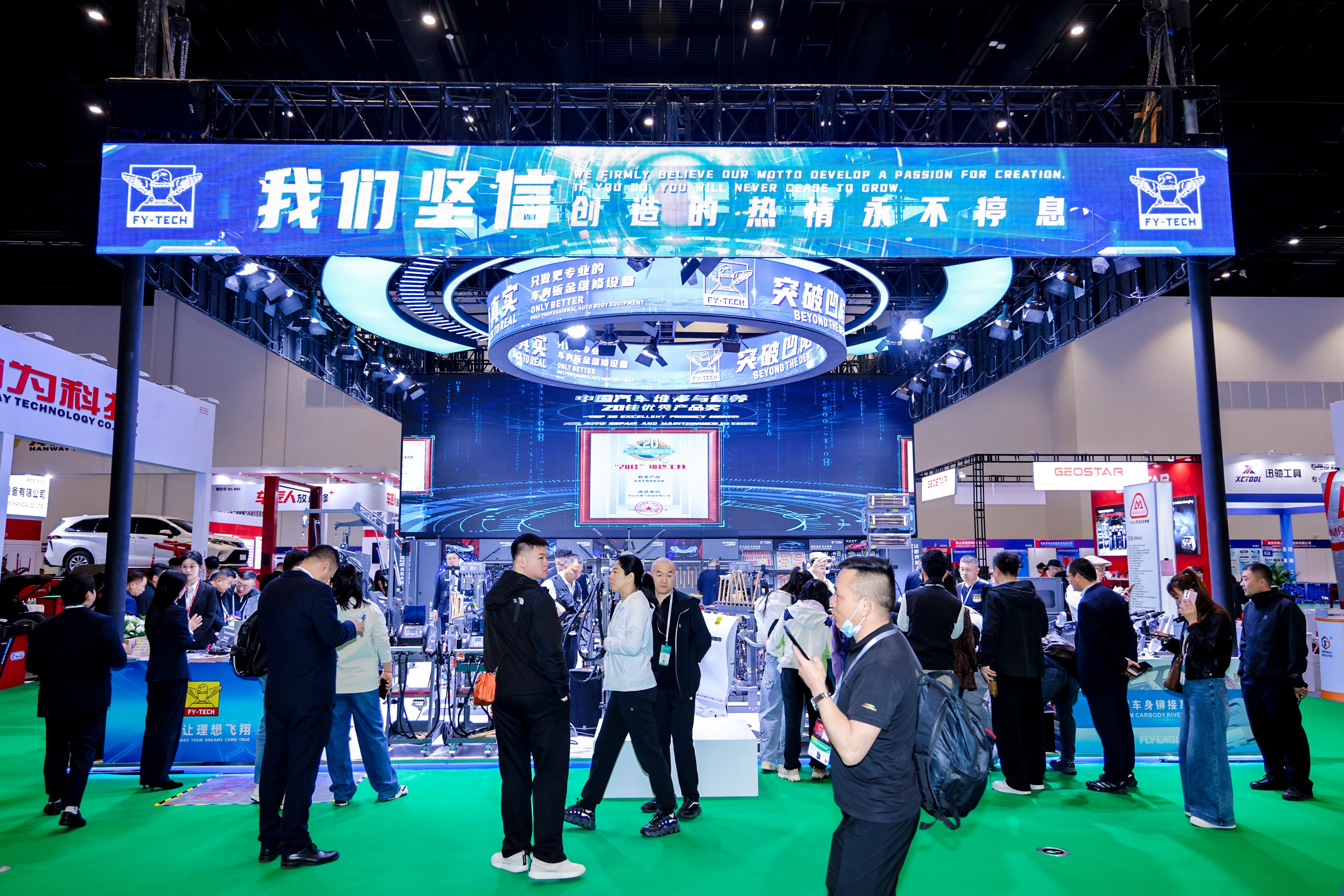 作为展会核心板块之一,维修及保养板块增幅达32%,安车、大力、飞鹰、火鹰、科吉、三雄以及通润等知名企业,以模拟真实车间环境的场景化模式,展示包括轮胎拆装与平衡检测、四轮定位校准、钣金修复、检测诊断设备及工具在内的产品及设备矩阵。