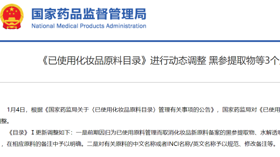 《已使用化妆品原料目录》进行动态调整 黑参提取物等3个原料按照已使用原料管理
