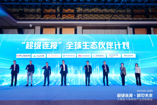 在峰会的核心成果发布环节,中关村科金、华为云、阿里云、百度智能云、火山引擎、亚马逊云科技、超聚变、软通动力等全球知名企业齐聚,共同发布“超级连接”全球生态伙伴计划,携手打造开放、连接、可持续的“人工智能+”产业生态圈。