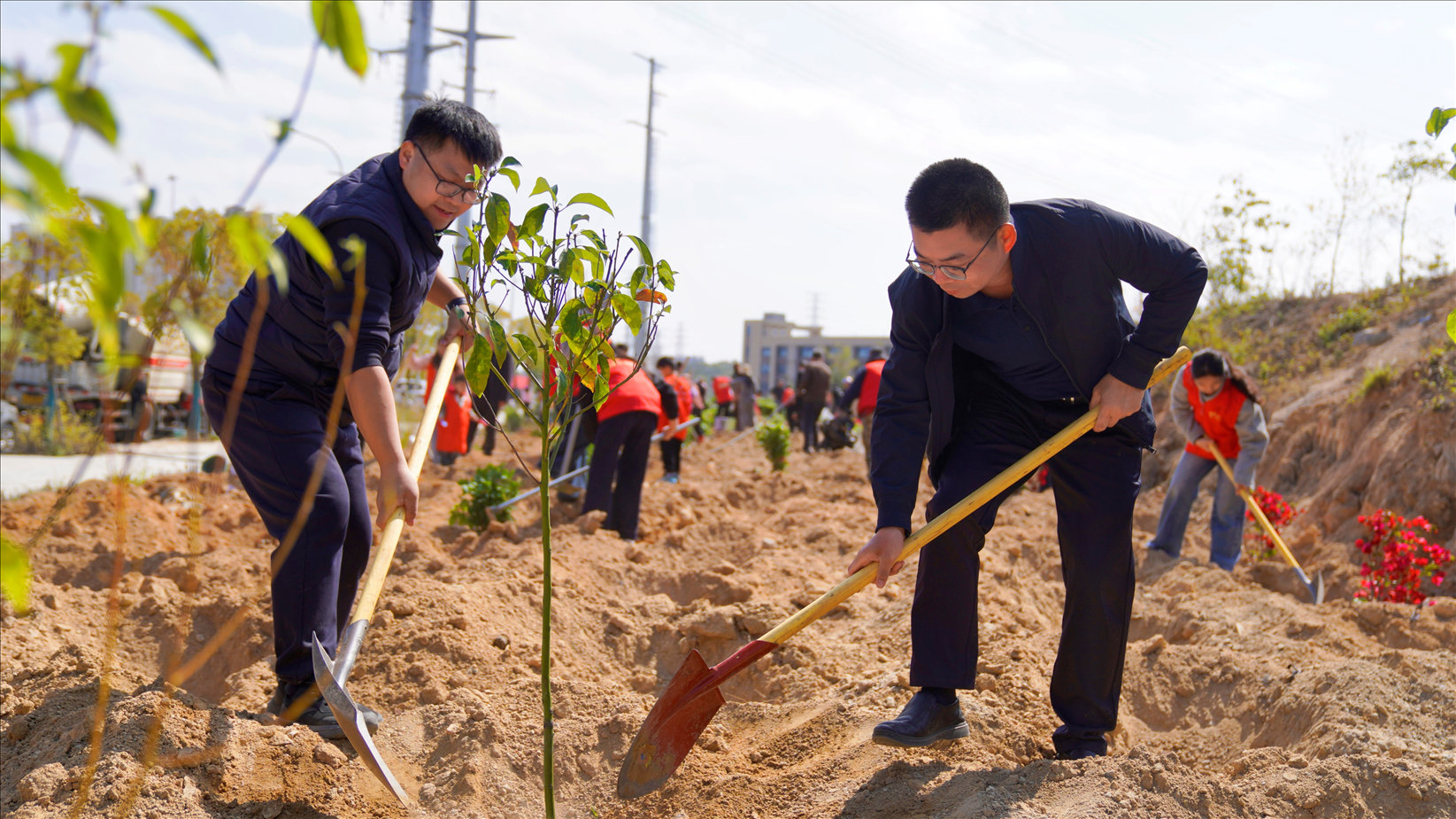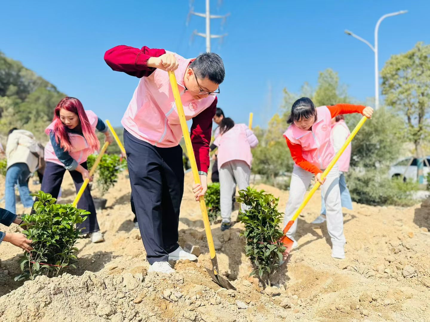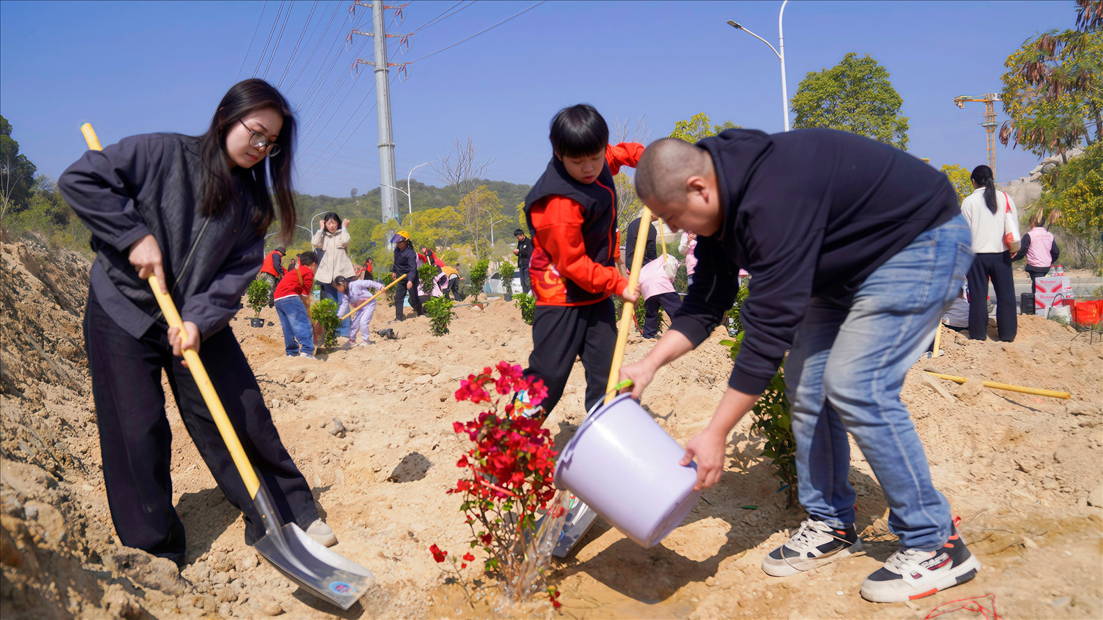植树现场,志愿者们分工协作,有人挥锹铲土、有人扶苗定根、有人提水浇灌,配合默契,一派热火朝天的忙碌景象,明媚暖阳下,新栽下的苗木错落挺立,带着生机与希望扎根在这片土地之中。