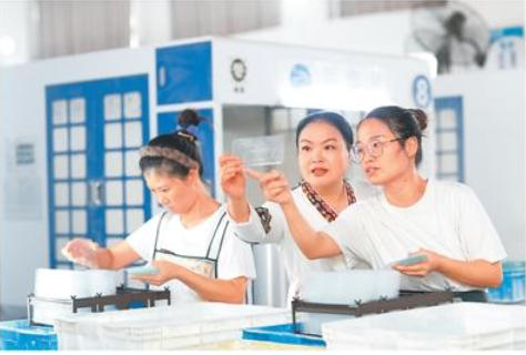 李洪梅(中)在指导员工加工手机膜。陈杰摄