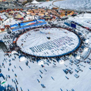 1月8日,在吉林省松原市,人们参加吉林·查干湖第24届冰雪渔猎文化旅游节开幕式(无人机照片)。新华社记者 颜麟蕴 摄