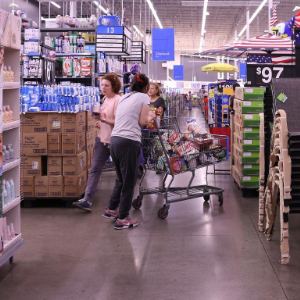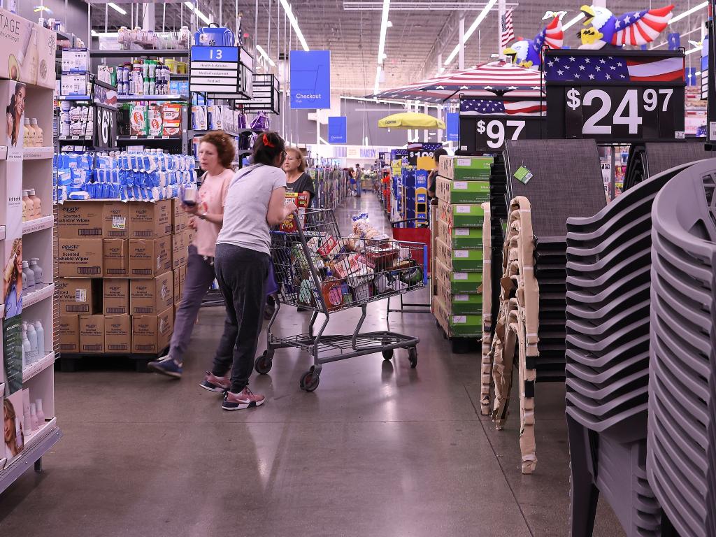 2025年5月20日,顾客在美国加利福尼亚州洛杉矶县一家沃尔玛商店内采购商品。新华社发(邱晨摄)
