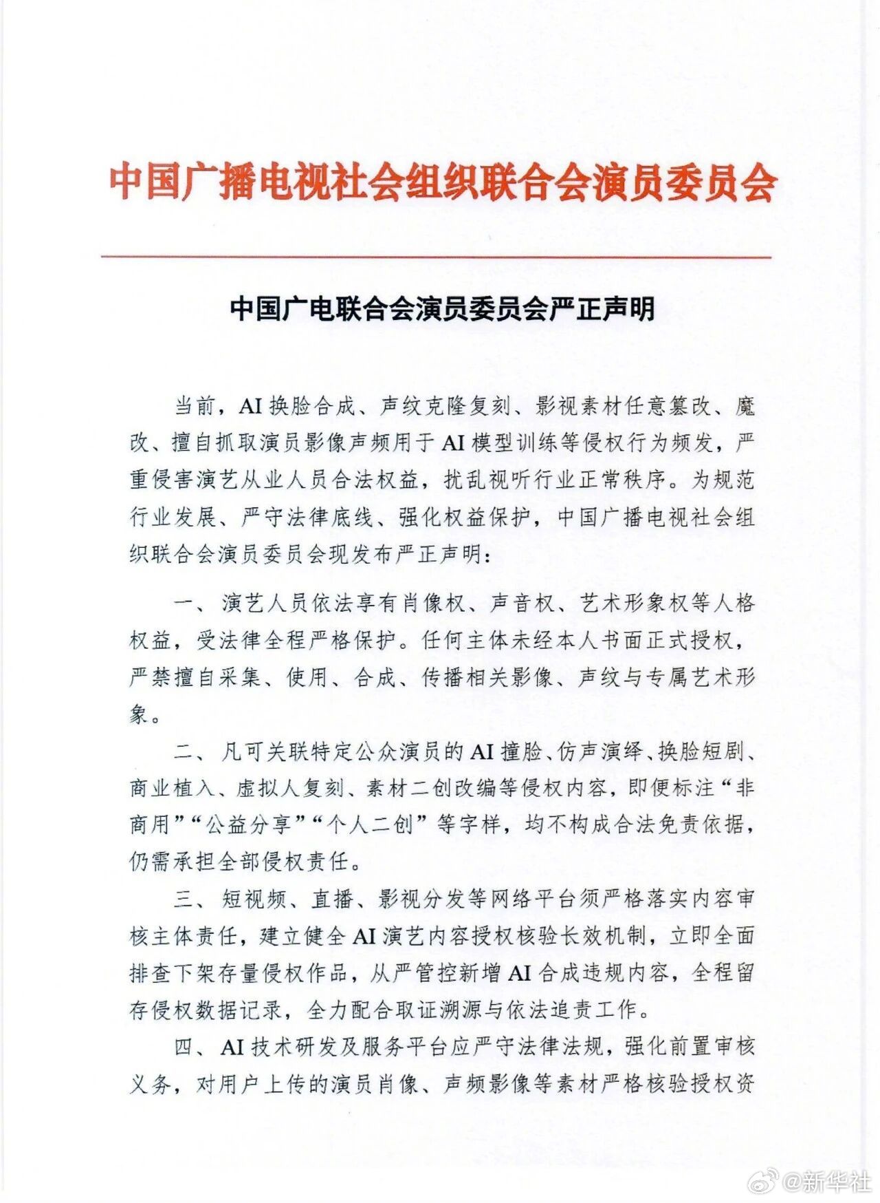 当前,AI换脸合成、声纹克隆复刻、影视素材任意篡改、魔改、擅自抓取演员影像声频用于AI模型训练等侵权行为频发,严重侵害演艺从业人员合法权益,扰乱视听行业正常秩序。为规范行业发展、严守法律底线、强化权益保护,中国广播电视社会组织联合会演员委员会现发布严正声明。(中国广电联合会演员委员会)