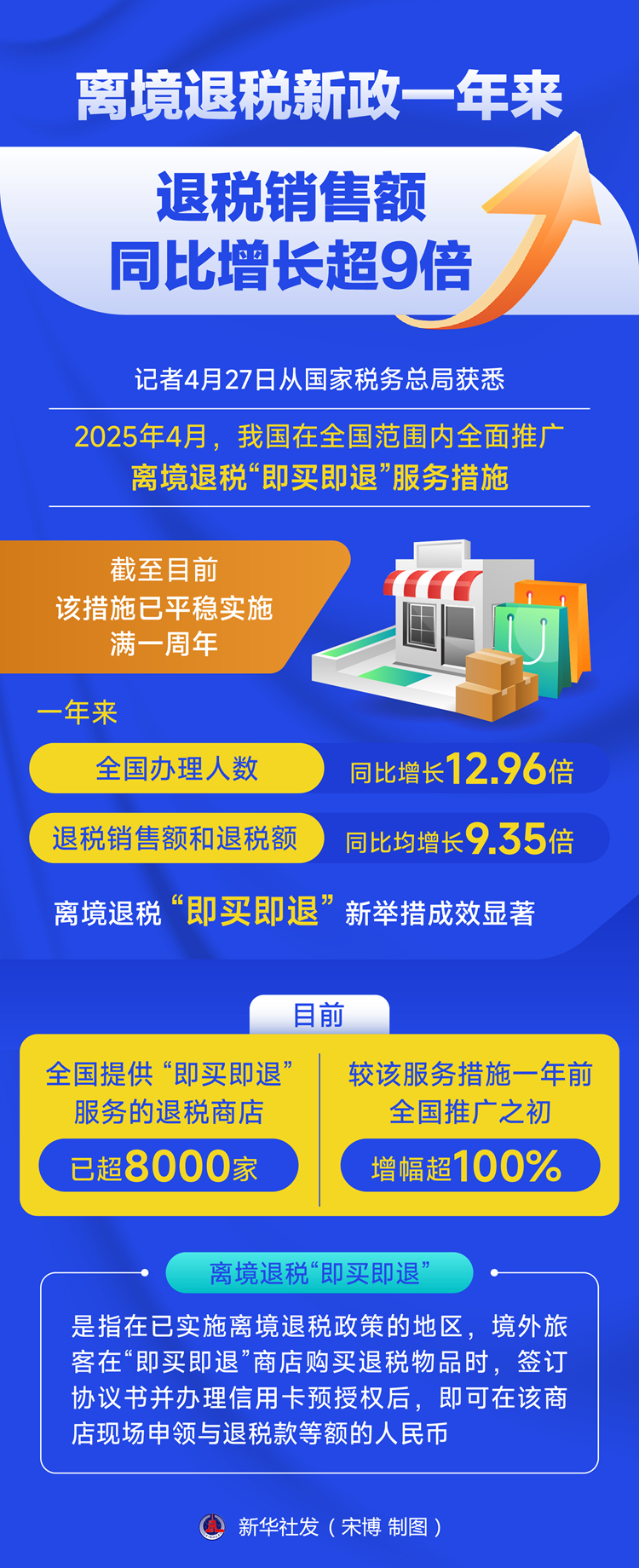 新华社北京4月27日电(记者刘开雄)记者4月27日从国家税务总局获悉,2025年4月,我国在全国范围内全面推广离境退税“即买即退”服务措施。截至目前,该措施已平稳实施满一周年。一年来,全国办理人数同比增长12.96倍,退税销售额和退税额同比均增长9.35倍。离境退税“即买即退”新举措成效显著。