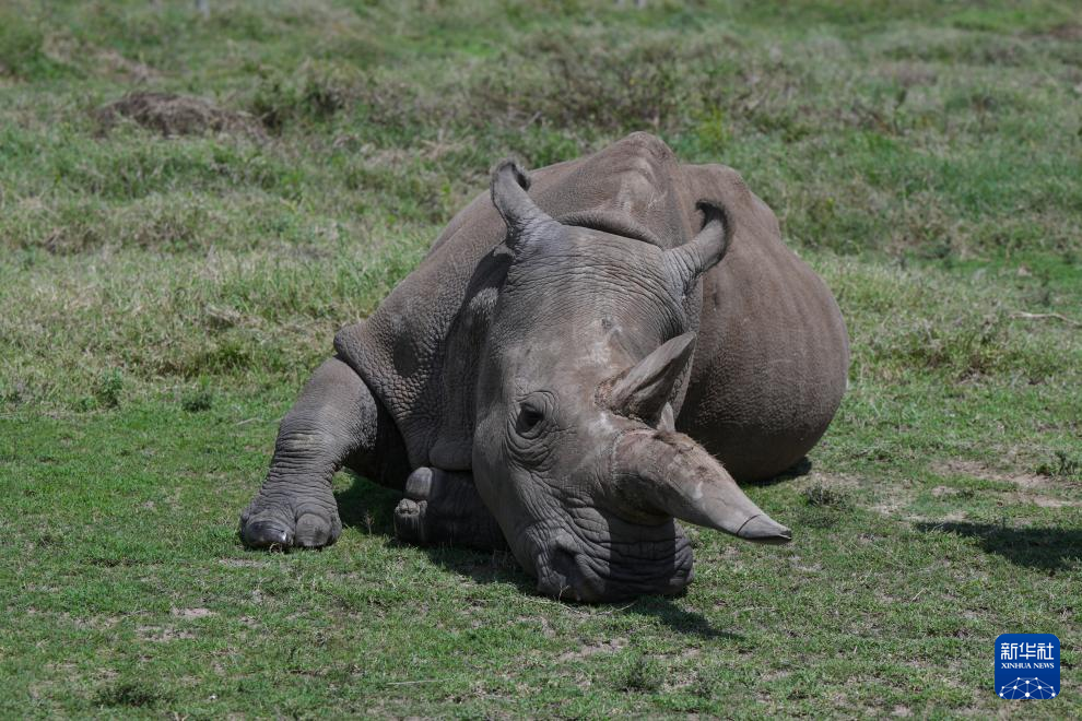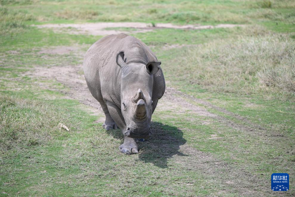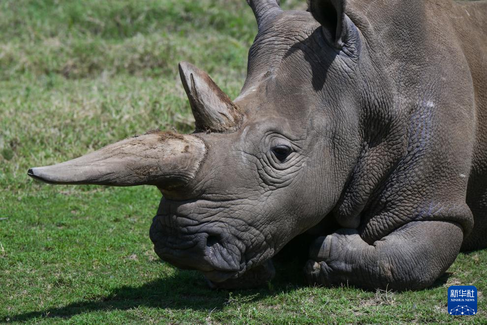 这是10月7日在肯尼亚中部莱基皮亚郡奥尔佩杰塔自然保护区拍摄的雌性北方白犀牛“娜金”。