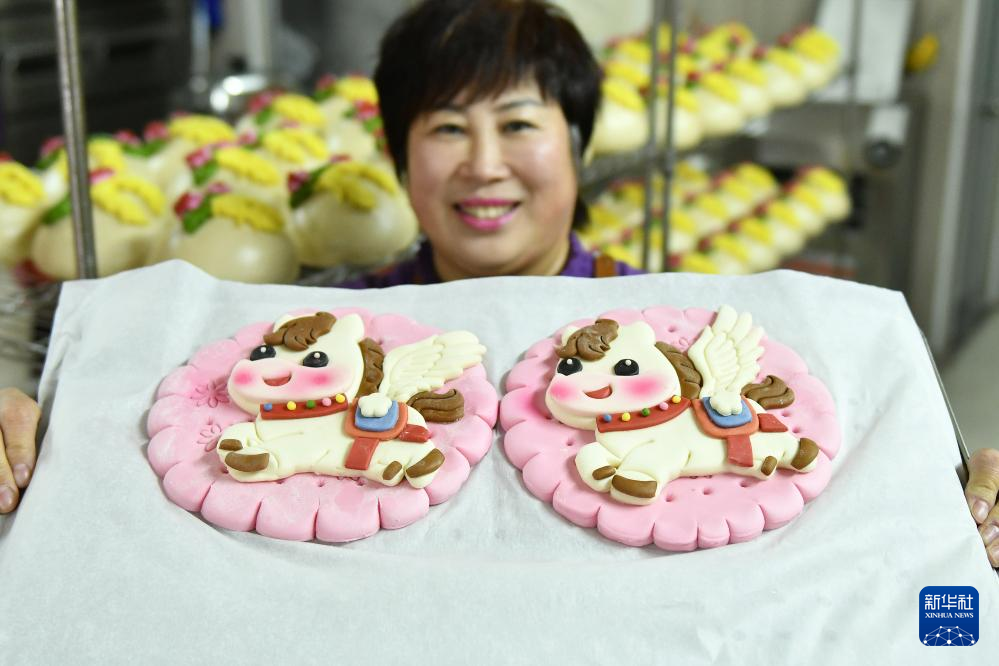 1月21日,在山东省烟台市福山区清洋街道一家面食作坊,面点师展示生肖马造型花饽饽。