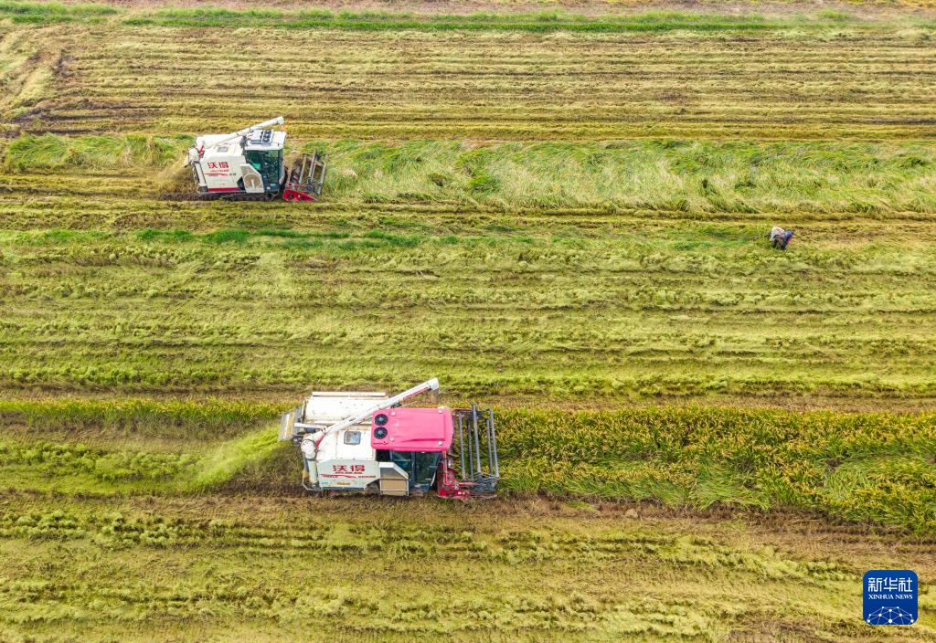 10月22日,在广西来宾市忻城县城关镇都乐村,农民驾驶收割机抢收晚稻(无人机照片)。