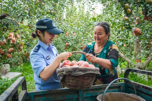 图为龚鑫钰联合派出所走进果园开展禁种铲毒宣传。阿克苏市公安局公安局供图