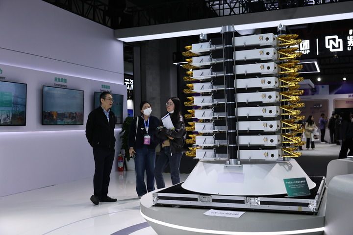3月12日,参观者在东方枢纽展区内展出的千帆星座一代堆叠卫星模型展品旁交流讨论。新华社记者 方喆摄