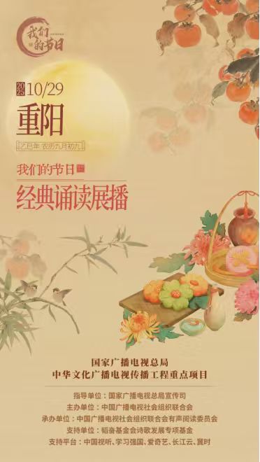 由国家广播电视总局宣传司指导,中国广播电视社会组织联合会主办,中广联合会有声阅读委员会承办的“我们的节日:经典诵读展播”重阳篇专题节目正式开播。节目以“鎏金岁月里的生命诗篇”为立意,通过名家诵读传情、民俗专家解读重阳习俗等方式,为听众献上一场“品秋韵、悟传承、暖人心”的精神文化盛宴。