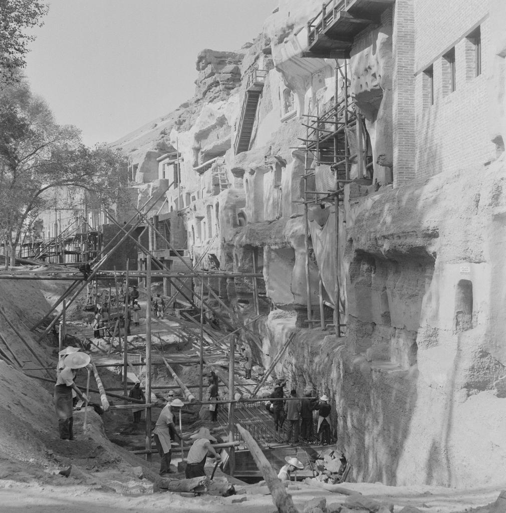 敦煌研究院工作人员对莫高窟部分洞窟进行加固施工(1964年7月8日摄)。新华社发