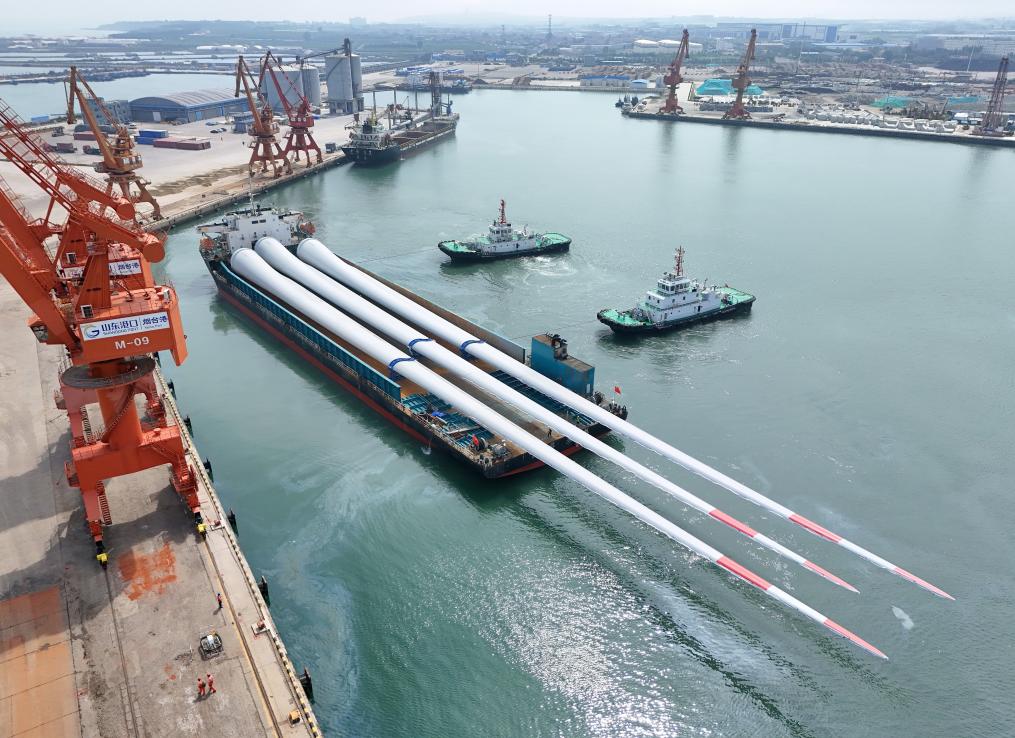 2025年8月1日,超大尺寸海上风电叶片从山东港口烟台港蓬莱港区起运(无人机照片)。新华社发(唐克摄)