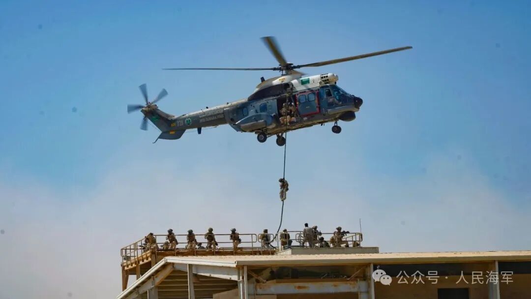 ▲中沙双方参训队员协同开展直升机滑降训练