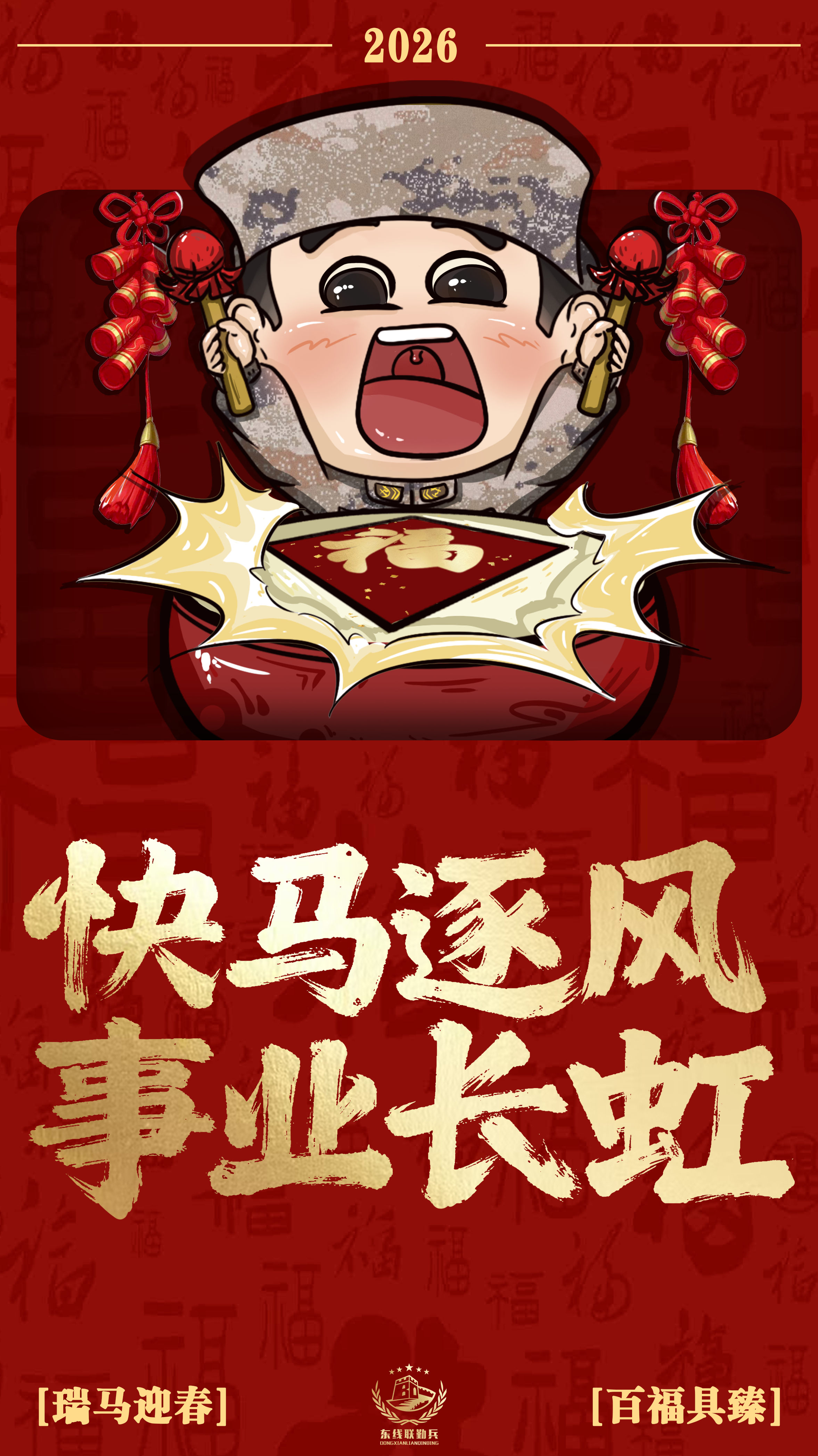 2026瑞马迎春,戎装焕彩贺新春!看兵哥哥卡通形象燃动年味,放鞭炮、舞醒狮,展军旅豪情。“马跃新程” 踏山海,“快马逐风” 启华章。东部战区联勤官兵携六重祝福,祝大家马年万事顺意、事业长虹,马行千里不负韶华,岁岁平安喜乐长安! (策划:赵若昕 董浩 形象设计:叶子民)