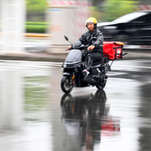 10月9日,在天津市南开区,一名外卖骑手在雨中行驶。