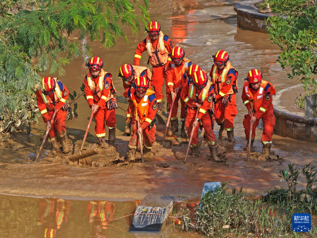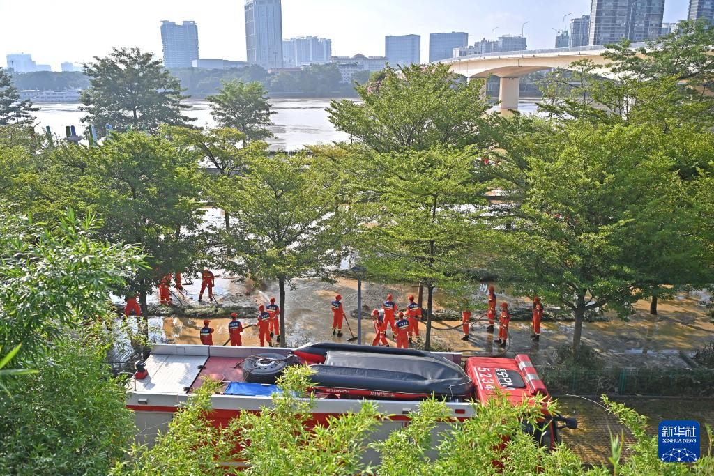 10月12日,消防救援人员在郁江广西南宁城区河段岸边清淤。