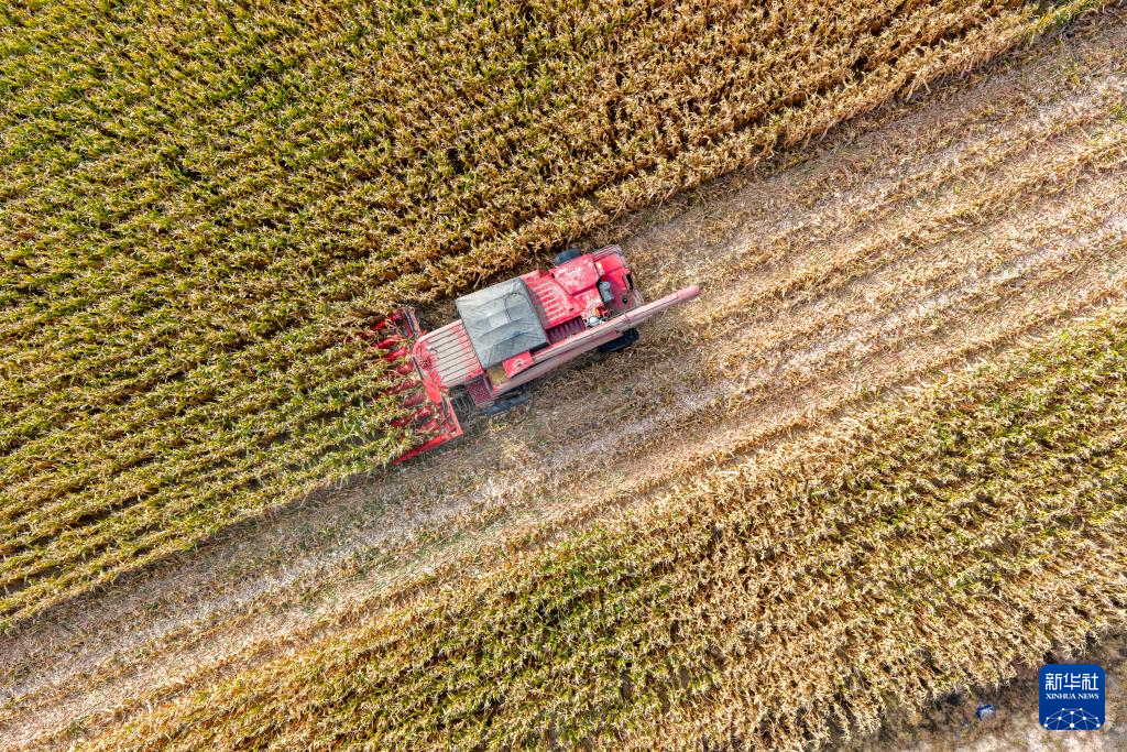 10月15日,在内蒙古巴彦淖尔市乌拉特前旗,农民驾驶农机收割玉米(无人机照片)。