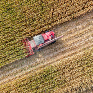 10月15日,在内蒙古巴彦淖尔市乌拉特前旗,工作人员遥控操作农机将玉米送入烘干塔(无人机照片)。