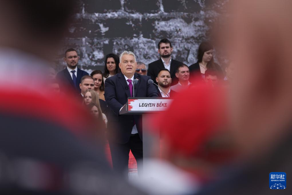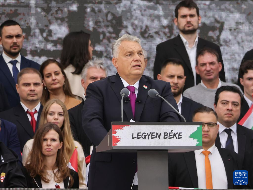 10月23日,匈牙利总理欧尔班(前右)在首都布达佩斯举行的一场集会上讲话。
