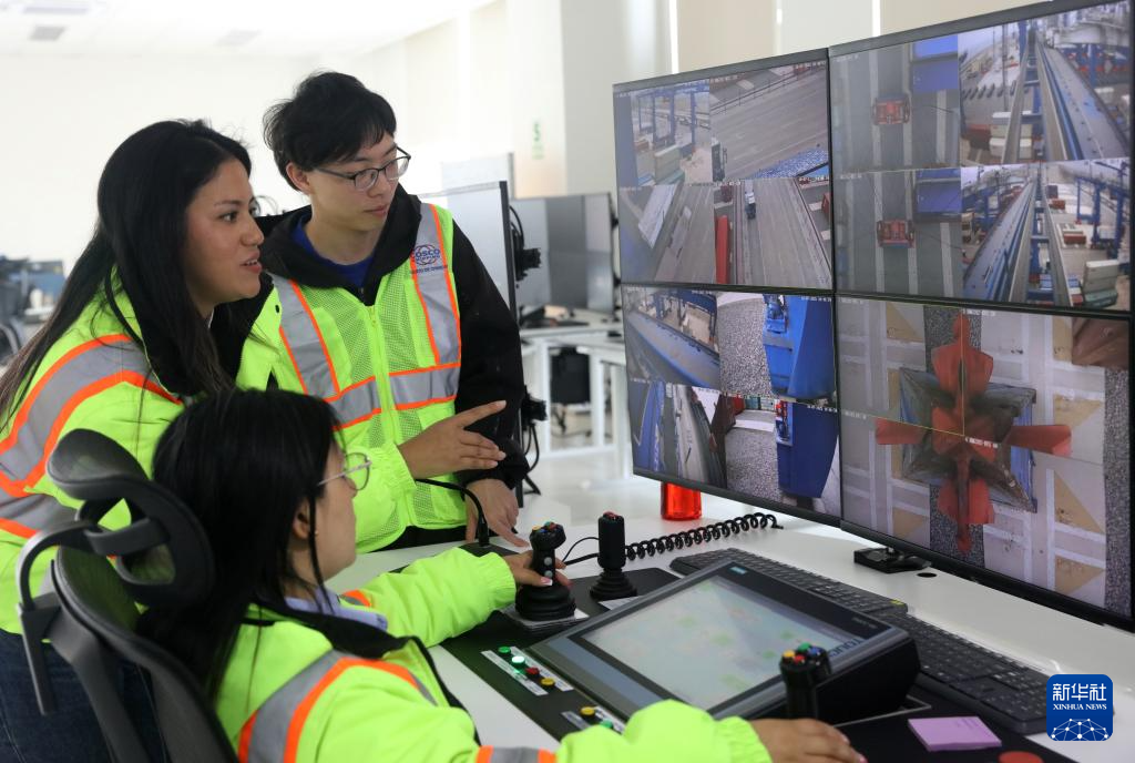 10月7日,在秘鲁钱凯港,中远海运港口秘鲁钱凯公司员工阿斯特丽德·洛萨诺(左一)与同事进行作业监控。