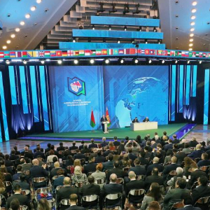 10月28日,在白俄罗斯明斯克,白俄罗斯总统卢卡申科在明斯克欧亚安全国际会议开幕式上发表讲话。