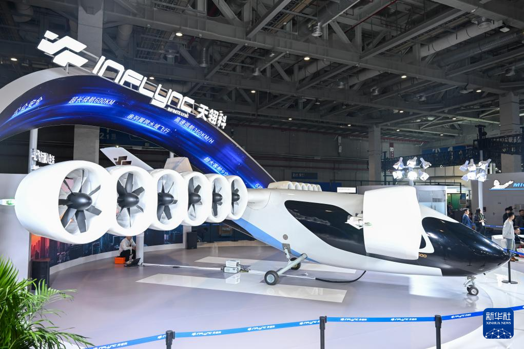 11月6日在进博会汽车及智慧出行展区天翎科展台拍摄的L600全尺寸倾转涵道翼eVTOL。这是该产品全球首发。