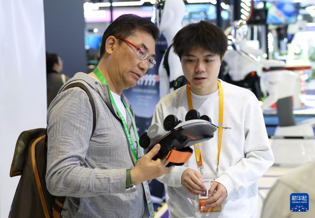 11月6日,在进博会创新孵化专区瞬动科技展台,一名展商(右)向参观者介绍其全球首发的踏月者Air轮式外骨骼。