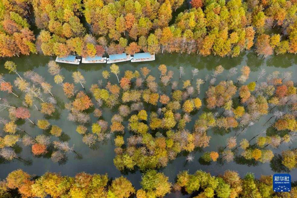 11月11日,在安徽省宣城市宁国市方塘乡,游客乘坐游船观赏红杉林(无人机照片)。