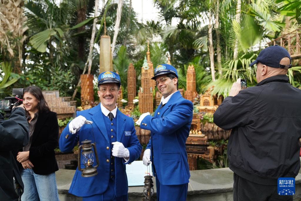 11月11日,在美国纽约植物园举行的节日小火车展预展上,工作人员身着铁路员工制服迎接游客。